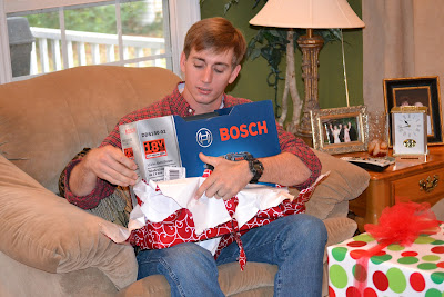 Jason's present...a table runner!!!! Which ended up being the wrong present, he opened up Rhett's grandmother's gift for the next night. haha. It was funny!